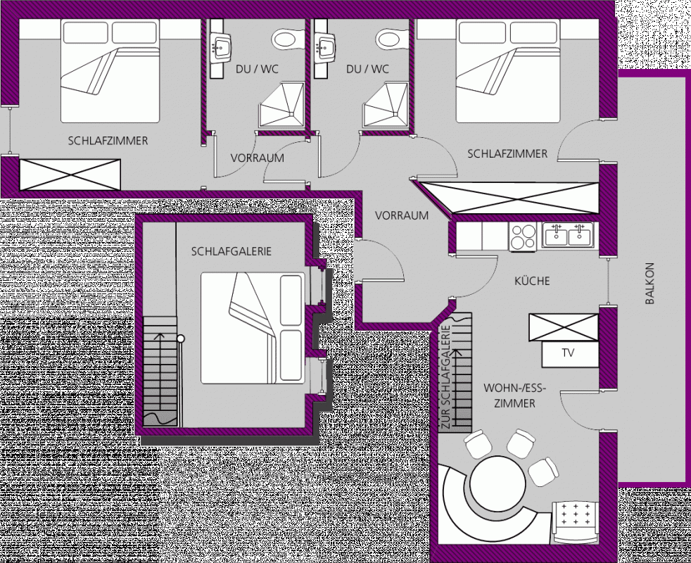 Der Hahnkamm versprüht den einzigartigen Charme der Strickhof-Wohnungen in ganz besonderem Maße. Vom Wohnzimmer aus geht es auf den originellen Schlafboden „Adlerhorst“ – ein absoluter Kindheitstraum! Zwei weitere Schlafzimmer, ein großer Balkon und gleich zwei Badezimmer komplettieren den 75m² großen Hahnkamm.